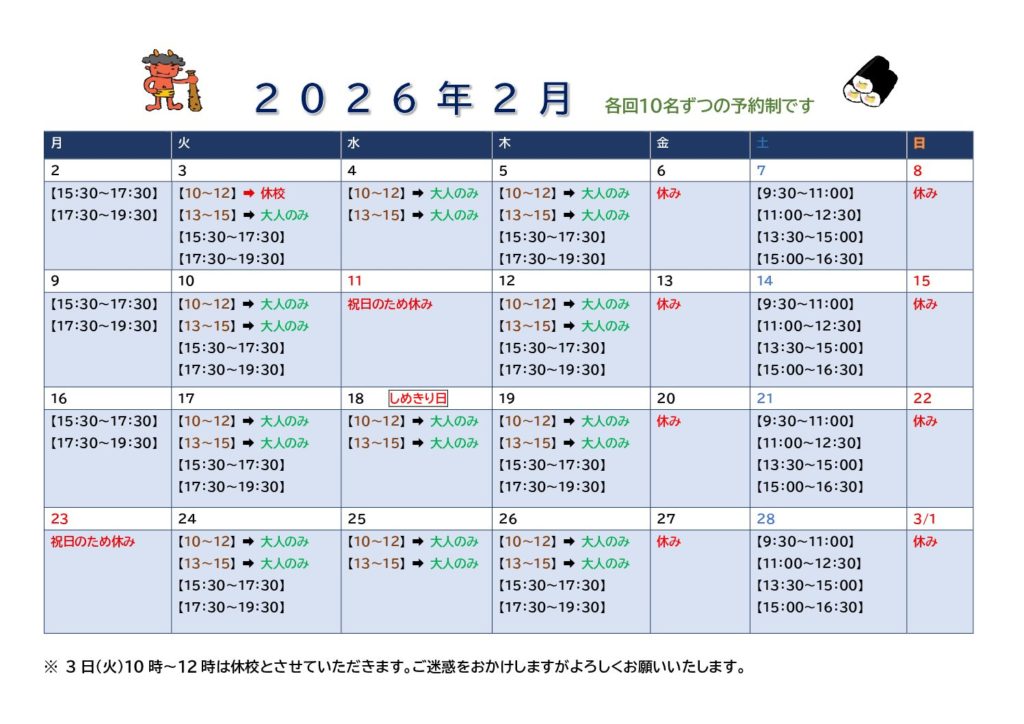 玉兔書道教室2月カレンダー